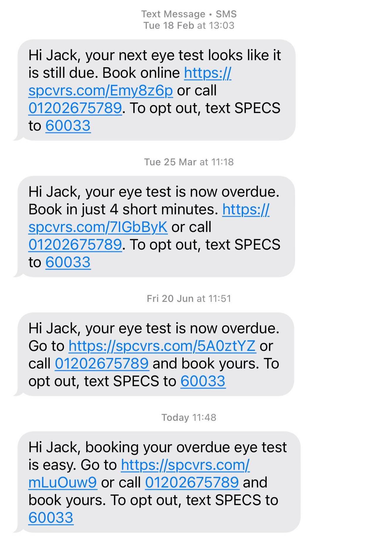 For context, the whole idea for this email all started when we both started getting these texts from Specsavers and spent at least 20 minutes in our weekly kickoff call moaning about them👇