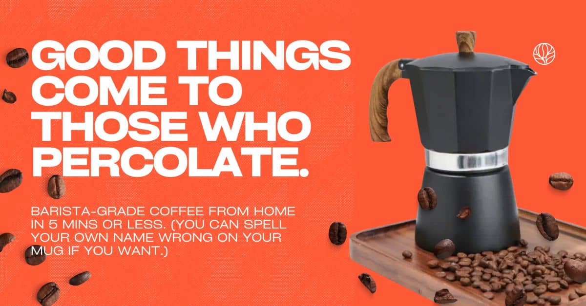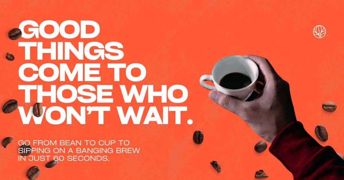 The cliche flip grabs attention and ticks all the brain science boxes while the wait β percolate speaks to speed/convenience, identity and quality.