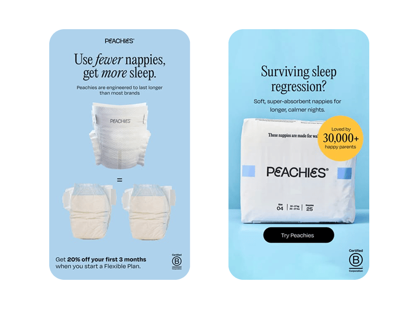They focus on the daily win, not the rare disaster. Leaks and poonamis happen every now and again. Sleep deprivation happens every night. And when Peachies are asking for a monthly subscription not a quick impulse purchase, they need messaging that makes their product feel like it's going to have daily value.