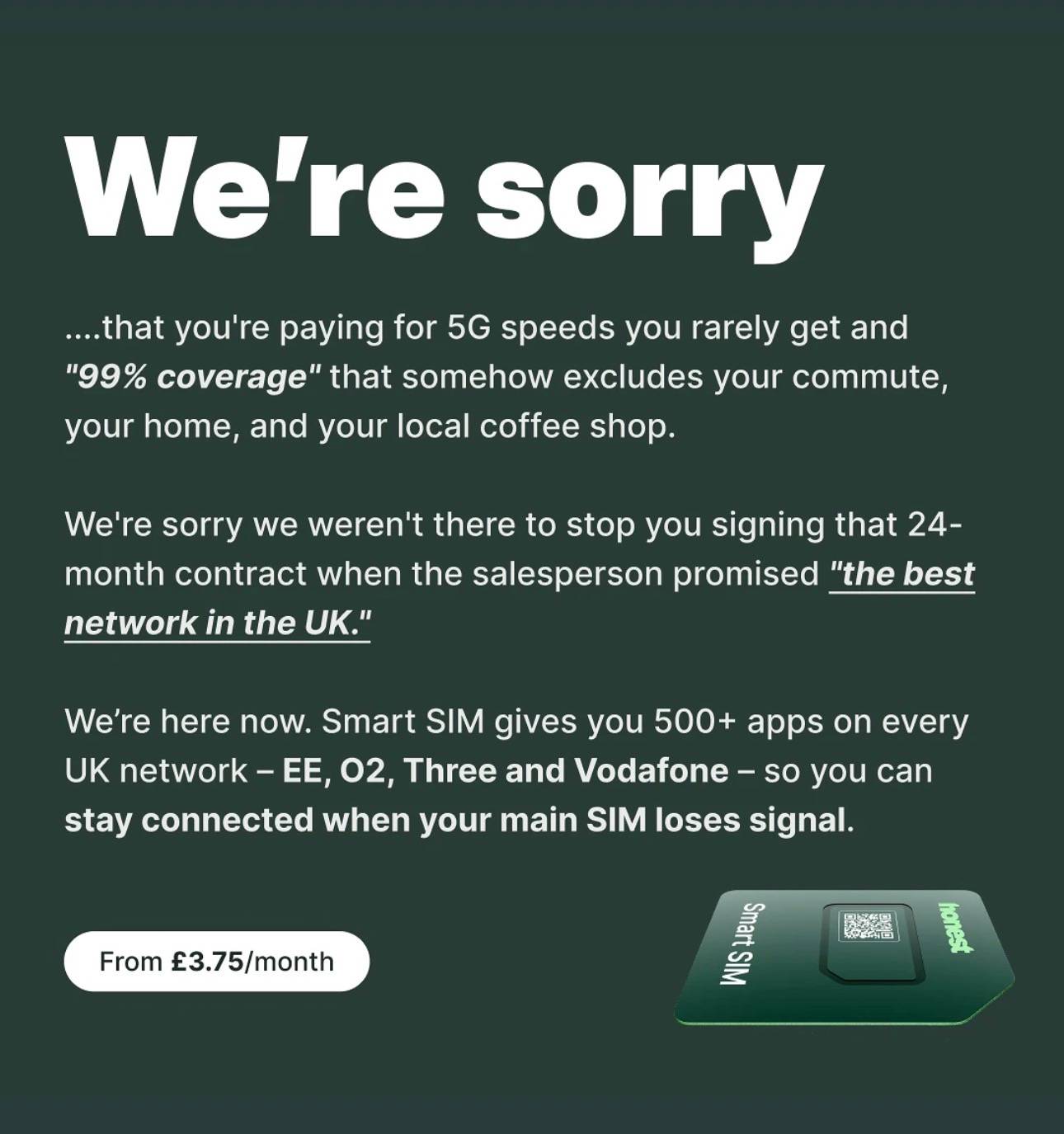 At first glance, this looks like it belongs in the same “challenger brand apology” bucket as Honest Mobile.