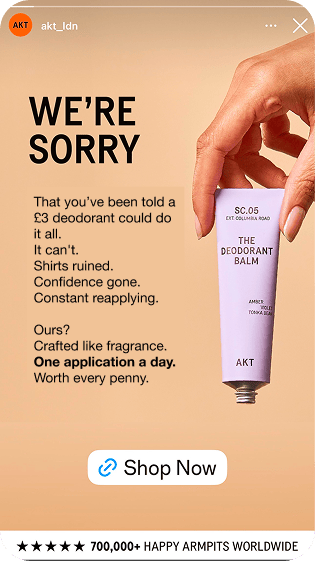 👉 “We’re sorry” is a clever pattern interrupt. In our brains, seeing an apology in the context of a social media feed where brands typically try to present the best version of themselves stands out. Basically, we scroll absent-mindedly and everything blurs into one. Something that is novel stands out, grabs our attention and makes us remember it for longer. (That's a mix of the oddball paradigm and the Von Restorff Effect.)